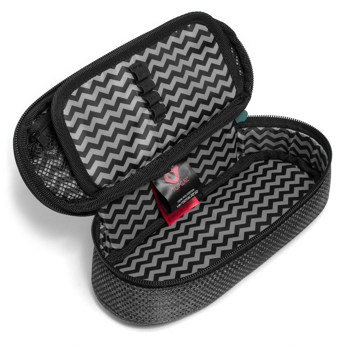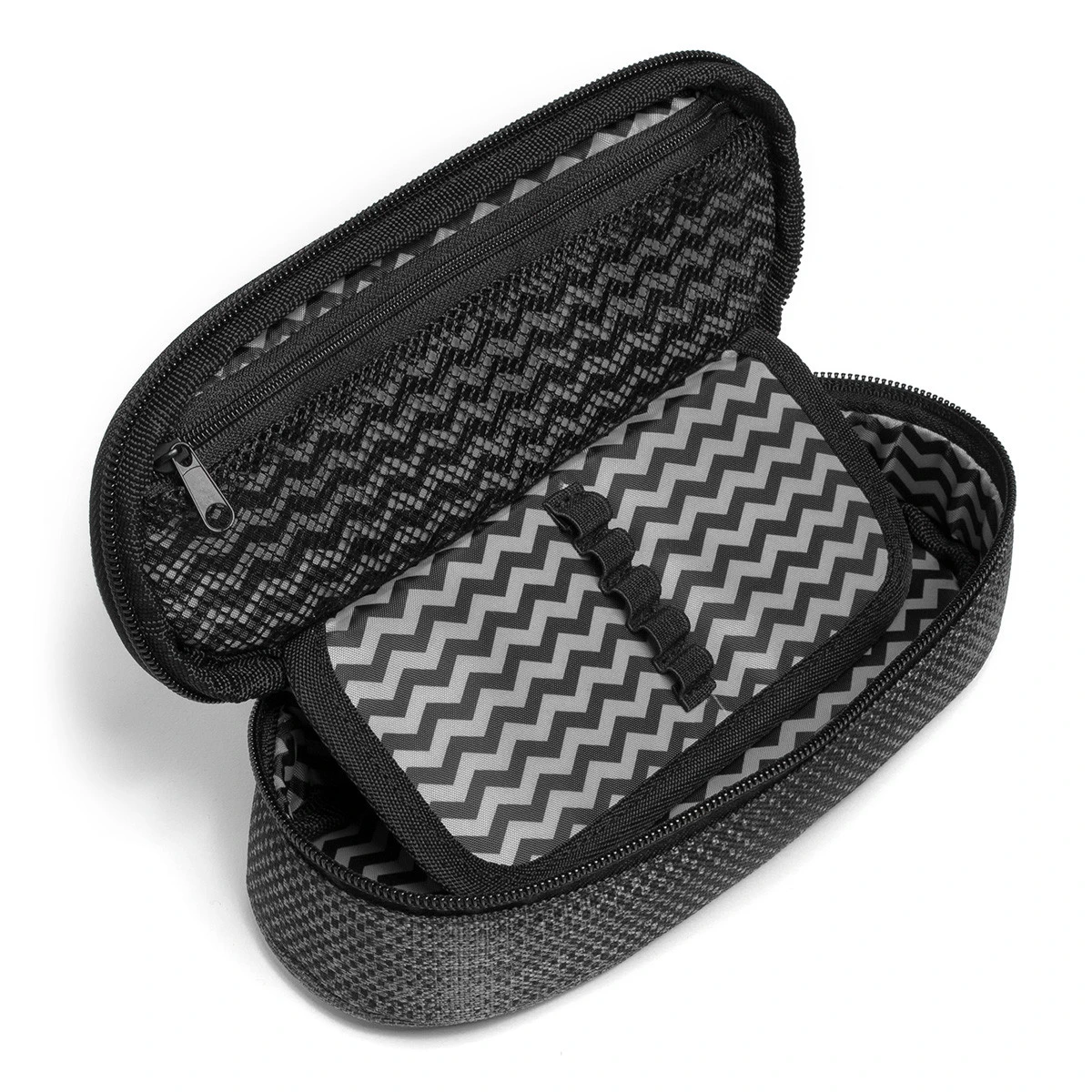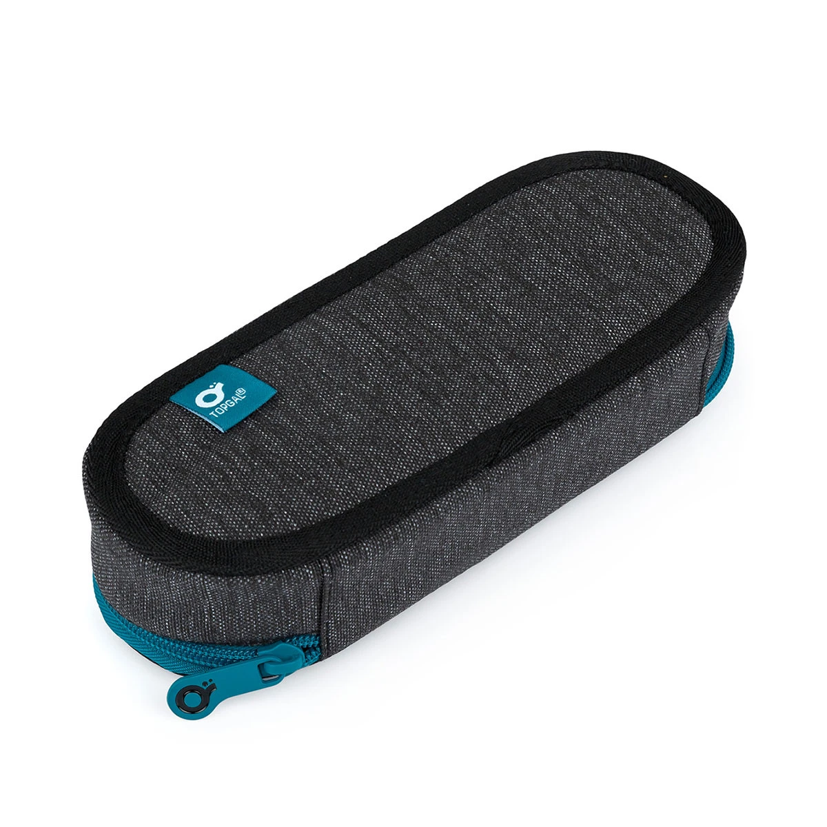 Ovales Federmäppchen für alle Bedürfnisse. Im Inneren befindet sich eine Netztasche mit Reißverschluss und einer Klappe, an der Gummibänder zur Befestigung von insgesamt neun Bleistiften und Stiften angebracht sind, die übersichtlich und griffbereit sein müssen. Der Freiraum unter der Klappe ermöglicht es Ihnen, weitere Schreibwahren frei zu platzieren – Buntstifte, Marker, was auch immer Sie brauchen.
