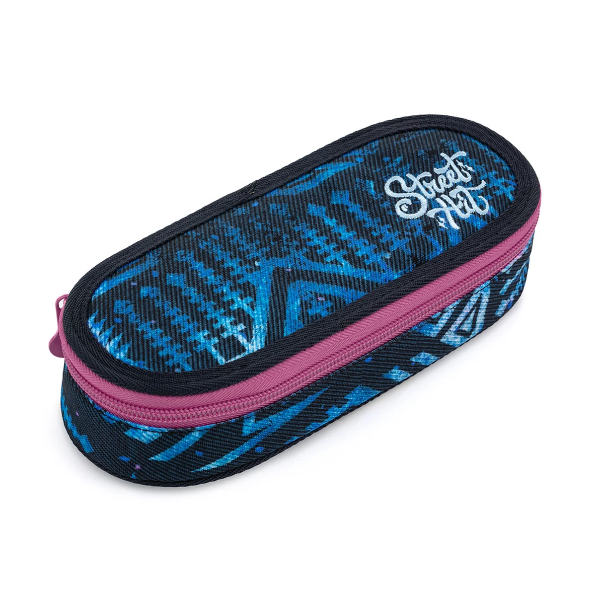 Ovales Federmäppchen für alle Bedürfnisse. Im Inneren befindet sich eine Netztasche mit Reißverschluss und einer Klappe, an der Gummibänder zur Befestigung von insgesamt neun Bleistiften und Stiften angebracht sind, die übersichtlich und griffbereit sein müssen. Der Freiraum unter der Klappe ermöglicht es Ihnen, weitere Schreibwahren frei zu platzieren – Buntstifte, Marker, was auch immer Sie brauchen.