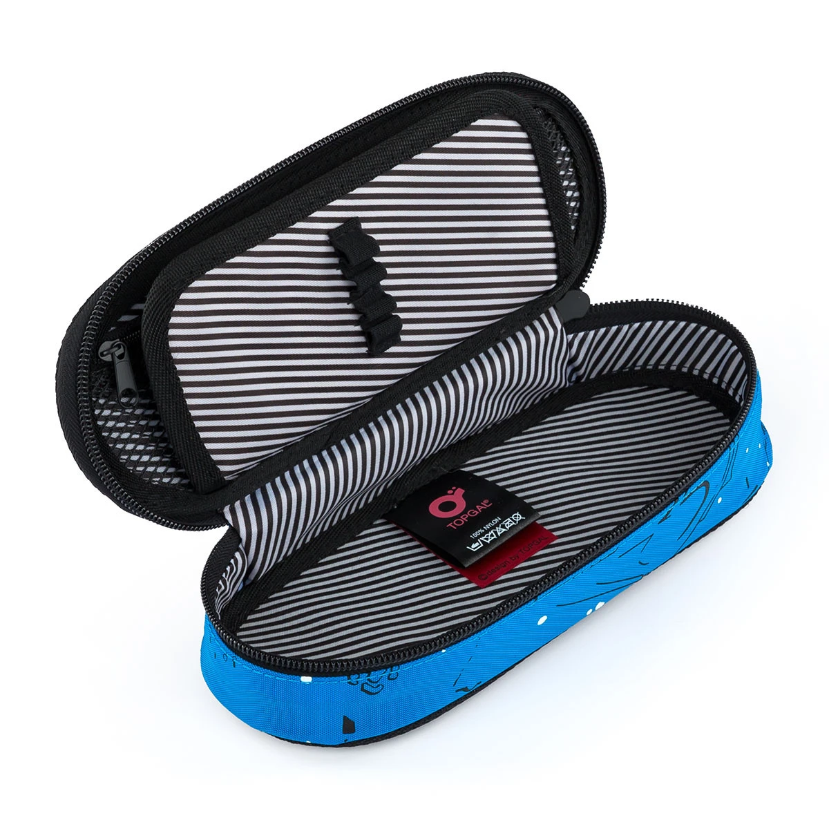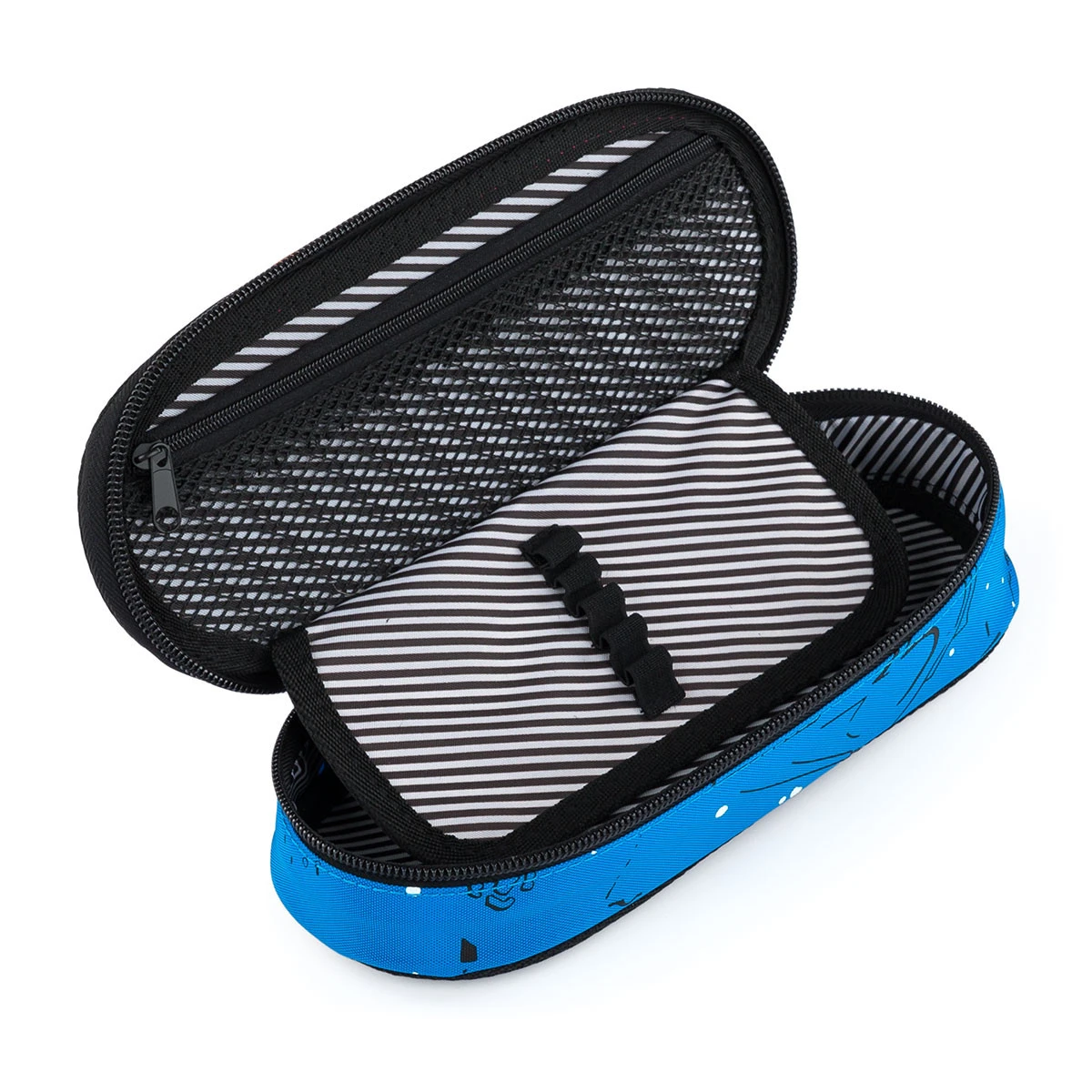 Ältere Schulkinder werden das ovale Federmäppchen für alle Bedürfnisse zu schätzen wissen. Im Inneren befindet sich eine Netztasche mit Reißverschluss und einer Klappe, auf der Gummibänder zur Befestigung von insgesamt neun Bleistiften und Stiften angebracht sind, die übersichtlich und griffbereit sein müssen. Der Freiraum unter der Klappe ermöglicht es Ihnen, weitere Schreibutensilien frei zu platzieren – Buntstifte, Marker, was auch immer Sie brauchen.