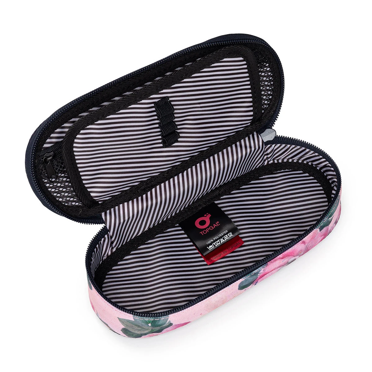 Ovales Federmäppchen für alle Bedürfnisse. Im Inneren befindet sich eine Netztasche mit Reißverschluss und einer Klappe, an der Gummibänder zur Befestigung von insgesamt neun Bleistiften und Stiften angebracht sind, die übersichtlich und griffbereit sein müssen. Der Freiraum unter der Klappe ermöglicht es Ihnen, weitere Schreibwahren frei zu platzieren – Buntstifte, Marker, was auch immer Sie brauchen.