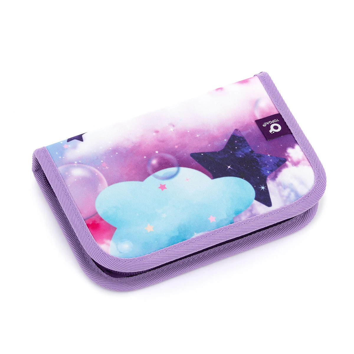 Das einstöckige Federmäppchen mit zwei Klappen ist mit 21 klassischen Gummigriffen für Buntstifte und Marker, drei breiteren Griffen für Lineal, Zirkel oder Schere und zwei größeren Griffen für Gummi und Spitzer ausgestattet. Unter der Klappe aus transparenter Folie befindet sich ein Stundenplan, der zweite wird z.B. auch für Zugbänder verwendet 🙂