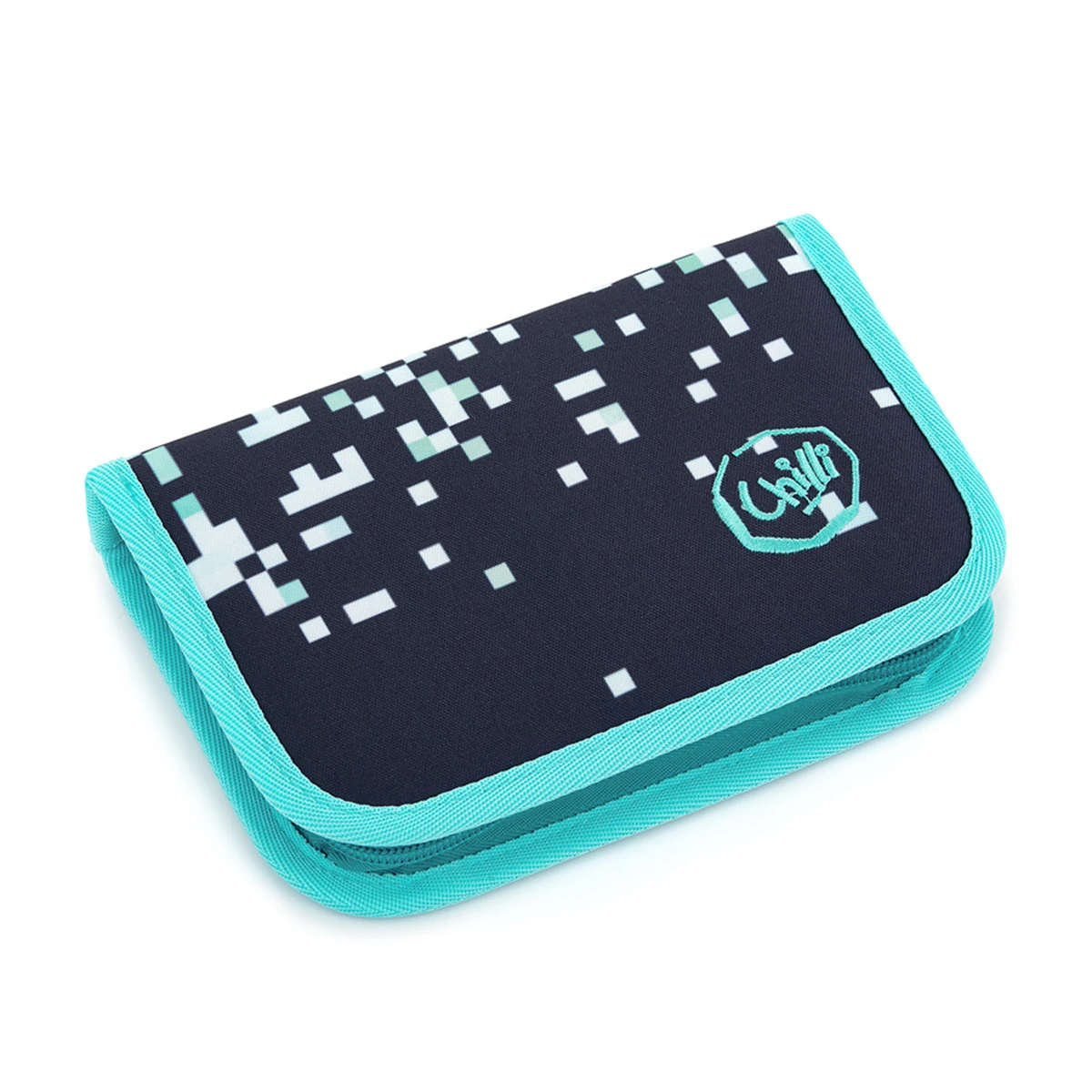 Das einstöckige Federmäppchen mit zwei Klappen ist mit 21 klassischen Gummigriffen für Buntstifte und Marker, drei breiteren Griffen für Lineal, Zirkel oder Schere und zwei größeren Griffen für Gummi und Spitzer ausgestattet. Unter der Klappe aus transparenter Folie befindet sich ein Stundenplan, der zweite wird z.B. auch für Zugbänder verwendet 🙂