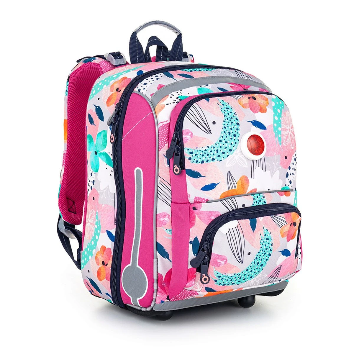 Ein Hauptfach der Aktentasche für ein Kind erleichtert die Organisation und Verteilung der Hilfsmittel. Der Innenraum der Aktentasche wird durch undurchlässige gummierte Trennwände in drei Teile geteilt. Im Hauptfach finden Sie ein kleines Reißverschlussfach und einen Organizer, zum Beispiel für Chipkarten und Stifte. Wir empfehlen, die Trinkflasche an der Seite der Aktentasche in der unter dem Reißverschluss versteckten Tasche zu verstecken. Auf der Vorderseite der BEBE-Aktentasche finden Sie zwei weitere Reißverschlusstaschen. Auf der oberen Reißverschlusstasche befindet sich ein aufgenähter Blinker, der in drei Programmen leuchten oder blinken kann. In der oberen Tasche finden Sie ein Namensschild und eine kleine Netztasche mit Reißverschluss. In die obere Tasche passt auch ein PENN 22001 Federmäppchen oder eine Snackbox. Die untere Tasche ist kleiner und kann wichtige Dinge wie Schlüssel oder Taschentücher aufnehmen.