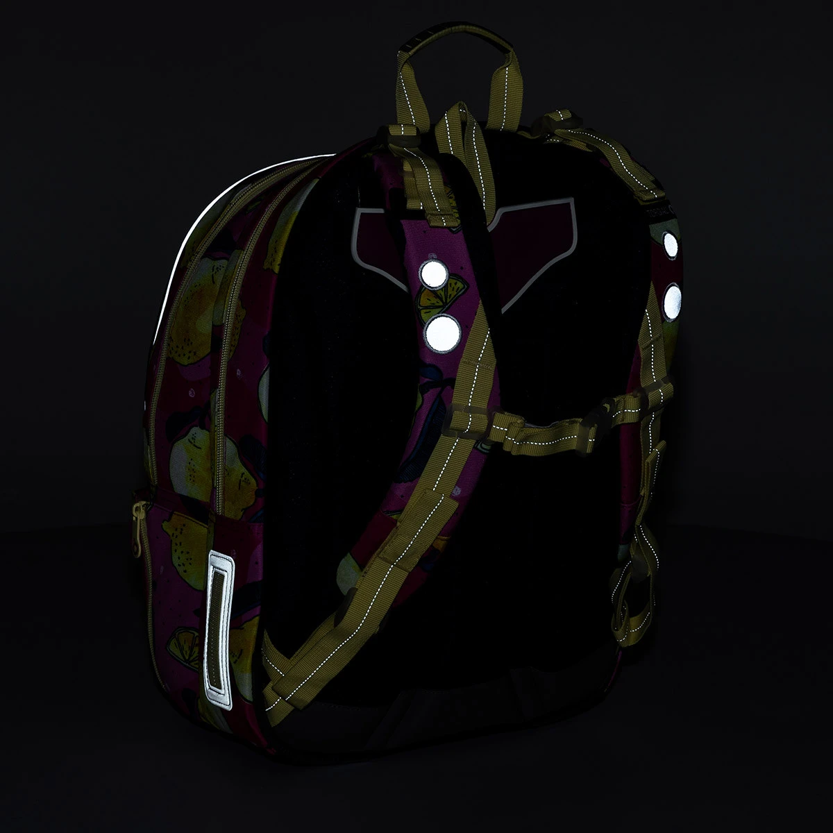 Wir haben den Rucksack an allen Seiten mit reflektierenden Elementen ausgestattet – was man auf den Detailfotos, die im Dunkeln aufgenommen wurde, gut erkennen kann.