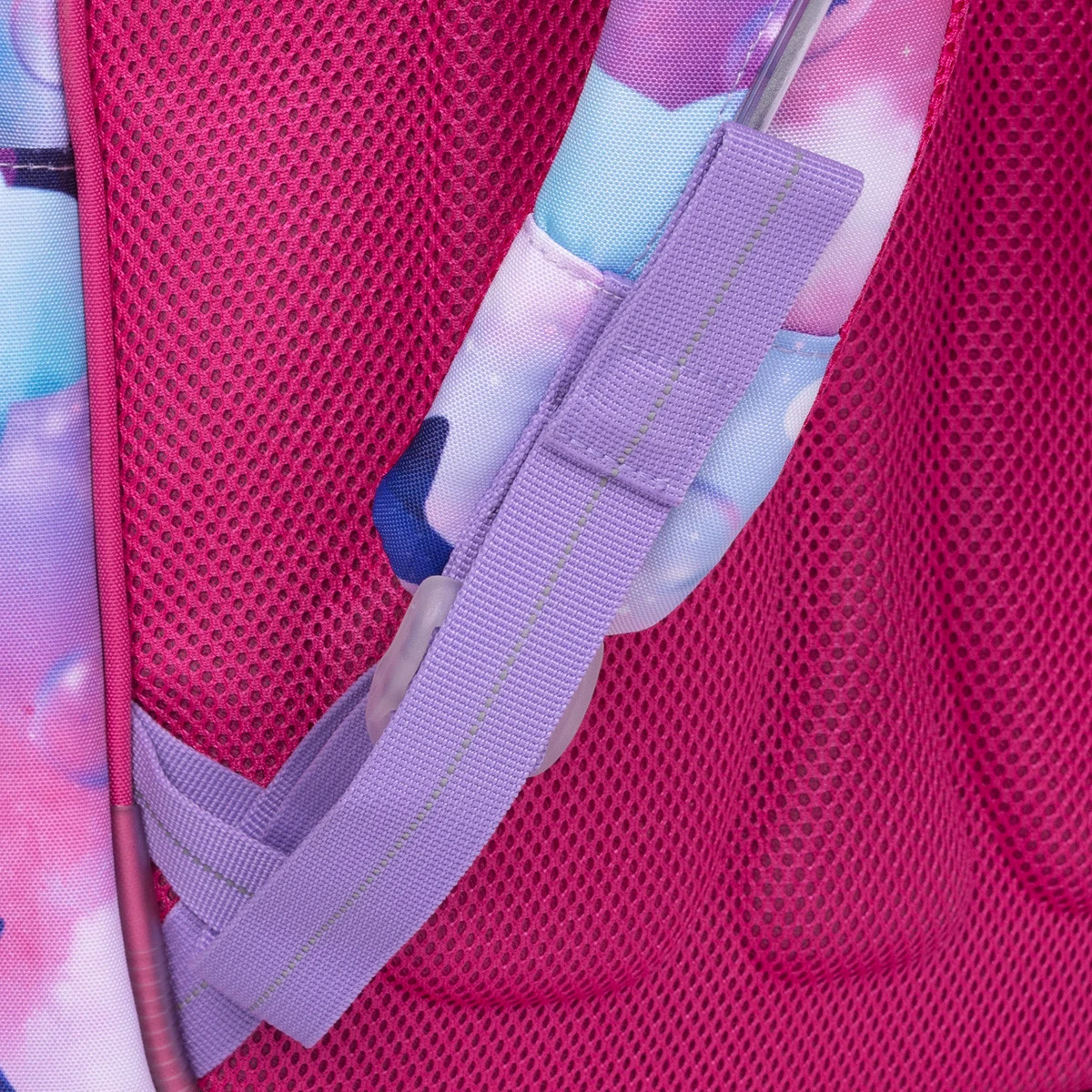 Die Rückseite des Rucksacks ist aus weichem Formschaum geformt, was den Rucksack so leicht macht. Die Schultergurte sind gepolstert, anatomisch geformt und können mit Schnallen unten vertikal und oben nach hinten geschnallt werden. – Sie fallen auch im Winter, wenn Kinder Jacken tragen nicht von den Schultern, keine Sorge. Die Schultergurte sind noch dazu mit einem höhenverstellbaren Brustgurt ausgestattet.