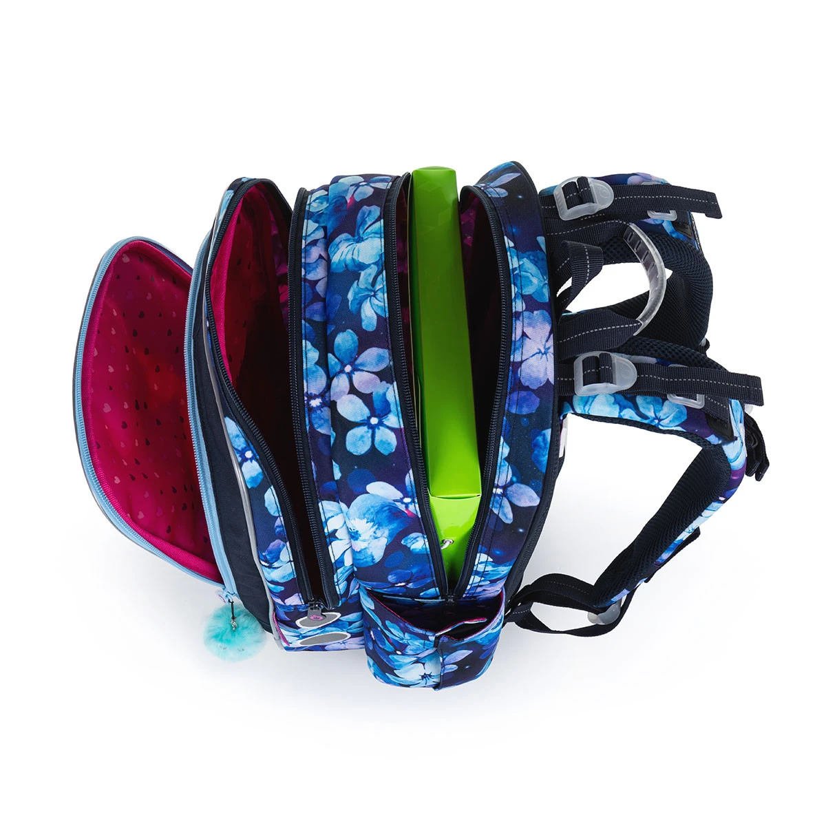 In der Tasche befindet sich auch ein abnehmbarer Karabiner, dank dem Sie nicht nach vergessenen Schlüsseln am Boden des Rucksacks unter Ihren Heften suchen müssen. Stecken Sie die Trinkflasche am besten in die Tasche an der Seite des Rucksacks.