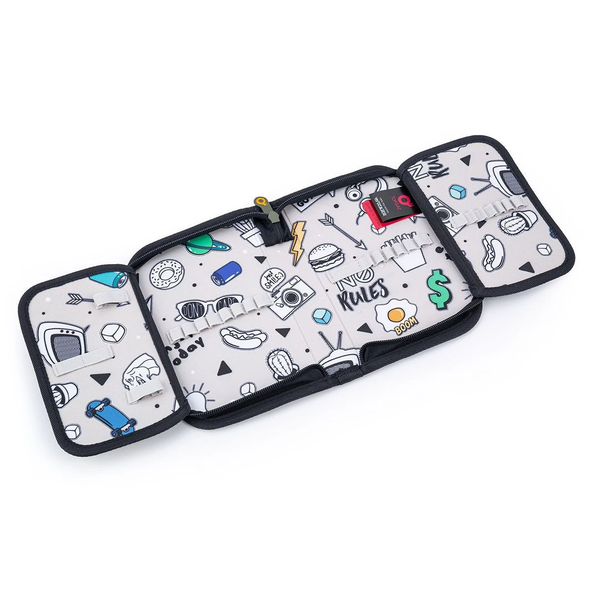 Der Rucksack hat drei geräumige Fächer. Die hintere Kammer ist breiter – wir empfehlen, die schwersten Schulbücher oder Notebook-Ordner nach hinten zu legen. Die vordere Kammer ist etwas schmaler und hat eine kleine Netztasche mit Reißverschluss und ein Namensschild. Das dritte (vordere) Fach wird z.B. für ein PENN Federmäppchen im gleichen Design oder eine Snackbox verwendet. Die Seitentaschen können Flaschen mit einem Fassungsvermögen von 0,5 Litern aufnehmen.