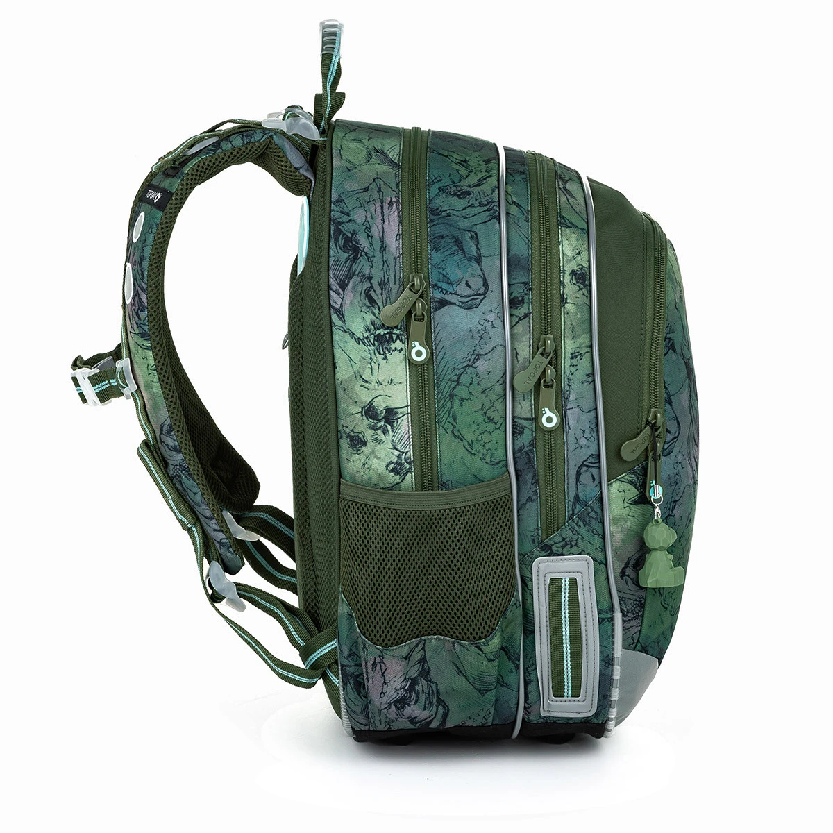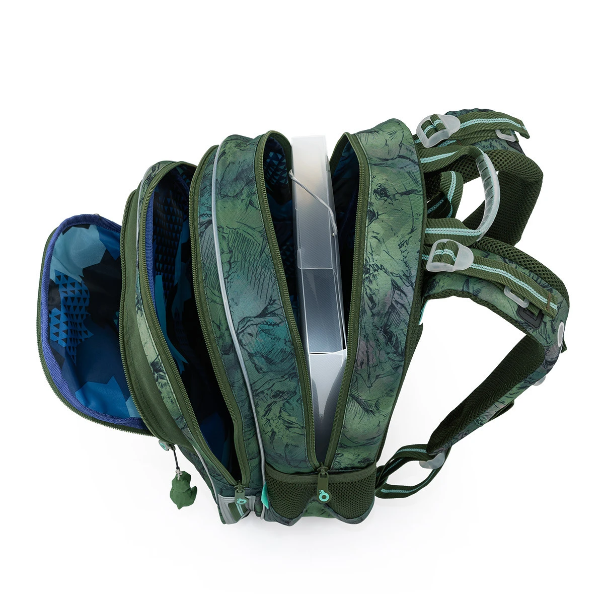 Die Rückseite des Rucksacks besteht aus leicht geformtem Schaumstoff. Dank der ergonomisch geformten, gepolsterten Träger trägt der Rucksack auch schwere Lasten bequem. Ziehen Sie zuerst die Gurte am Rücken des Schülers ganz unten an, damit der Rucksack auf dem Kreuz sitzt.