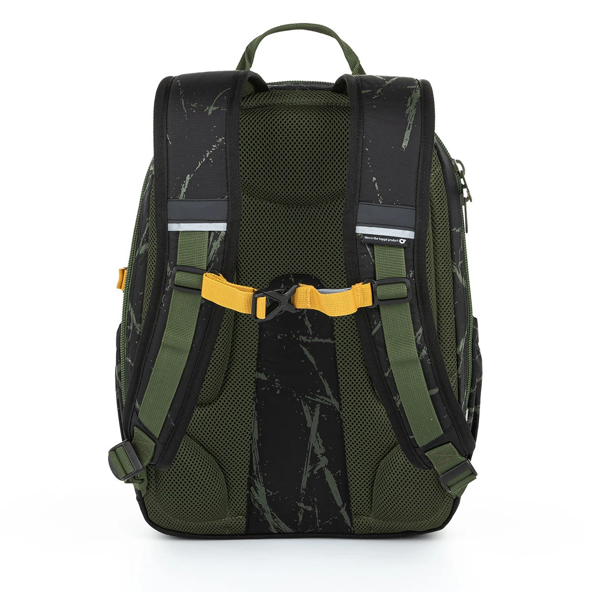RUBI Studentenrucksack in Schwarz mit khaki- und senfgelben Details. Idealer Rucksack für Schüler der zweiten Stufe der Grundschule, des Gymnasiums und der Hochschule. Die Rückseite des Rucksacks ist weich gepolstert, anatomisch geformt und mit Aluminiumverstärkung verstärkt. Auch die Schultergurte sind gepolstert und anatomisch geformt. Diese sind höhenverstellbar, ebenso wie der Brustgurt.