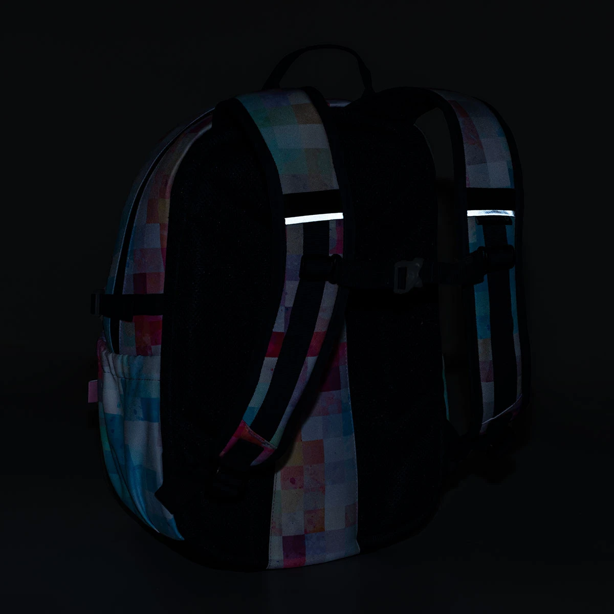An den Seiten des Rucksacks befinden sich zwei kleinere Taschen. Eine davon ist mit einem Kompressionsriemen ausgestattet, so dass man eine 1,5-Liter-PET-Flasche hineinstellen kann. An der Vorderseite des Rucksacks und an den Schultergurten sind reflektierende Elemente dezent eingearbeitet. Der Rucksack hat eine Regenhülle sowie einen Boden aus robustem, wasserdichtem TOPDURA-Material.