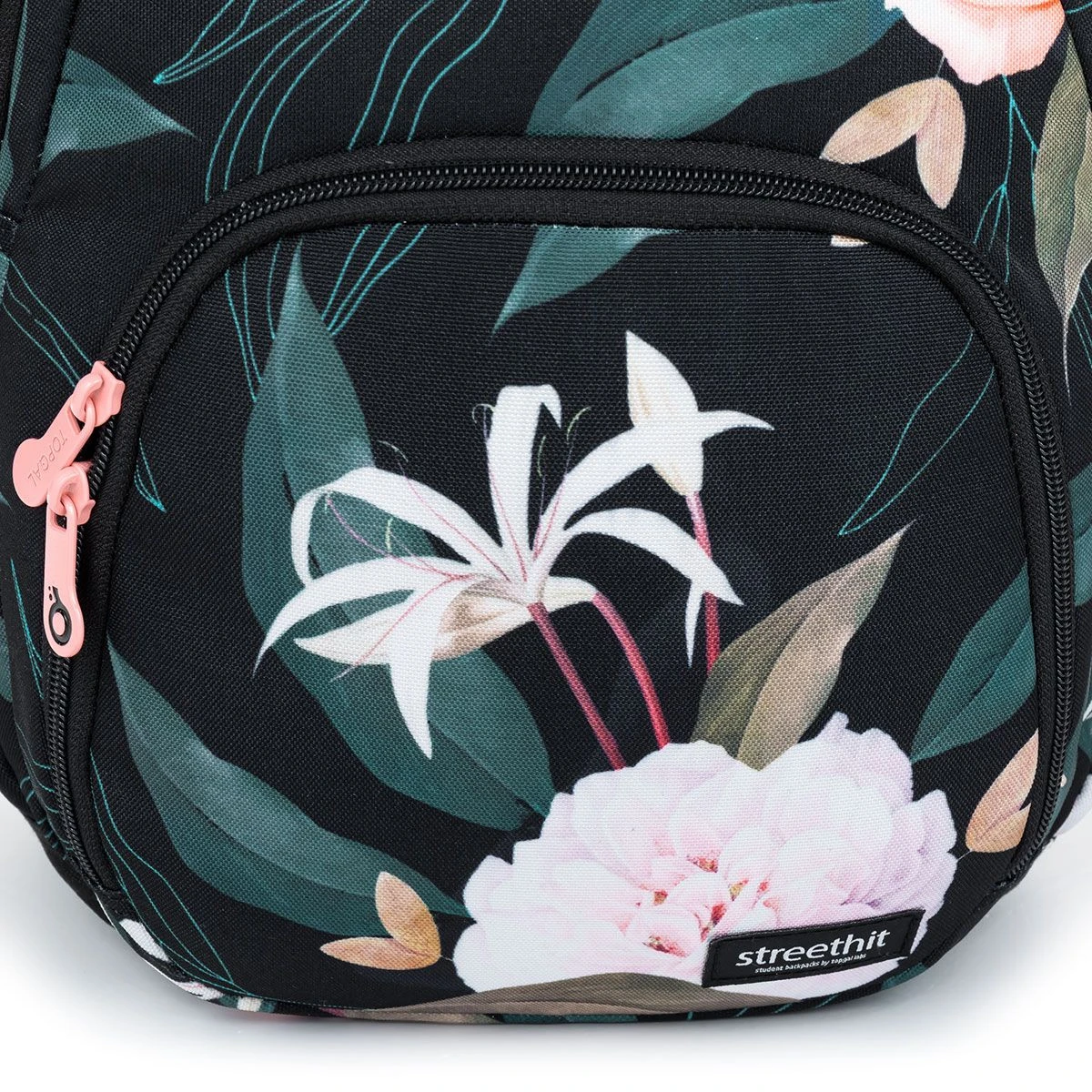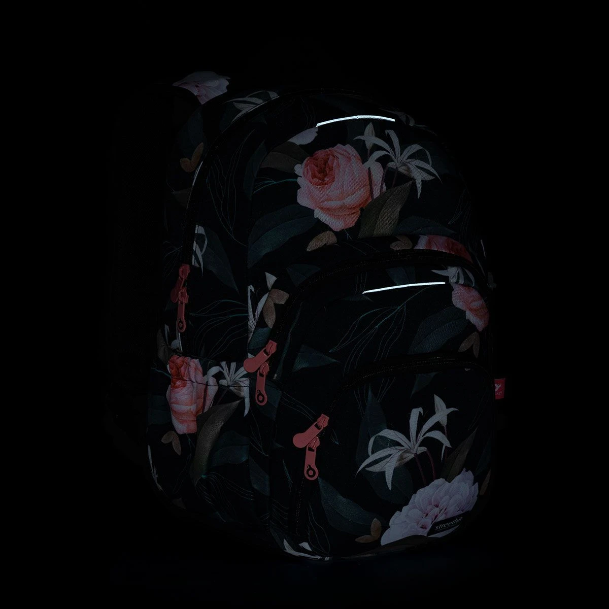 Der blühende Studentenrucksack passt dank seiner schwarzen Basis zu jedem Outfit. Der SKYE Ein-Kammer-Rucksack ist ein voluminöser Rucksack mit einem fest gepolsterten Rücken, aber geringem Gewicht. Das Fassungsvermögen reicht bis zu 28 Liter. Ein geräumiges Hauptfach fasst alles, was Sie brauchen. Im Inneren der Kammer befinden sich ein gepolstertes Laptopfach, eine praktische Netztasche mit Reißverschluss und ein an einer langen Schnur angenähter Schlüsselkarabiner. In den beiden kleineren Vordertaschen finden weitere Kleinigkeiten Platz – wie das Federmäppchen ETUE 22035 im gleichen Design.