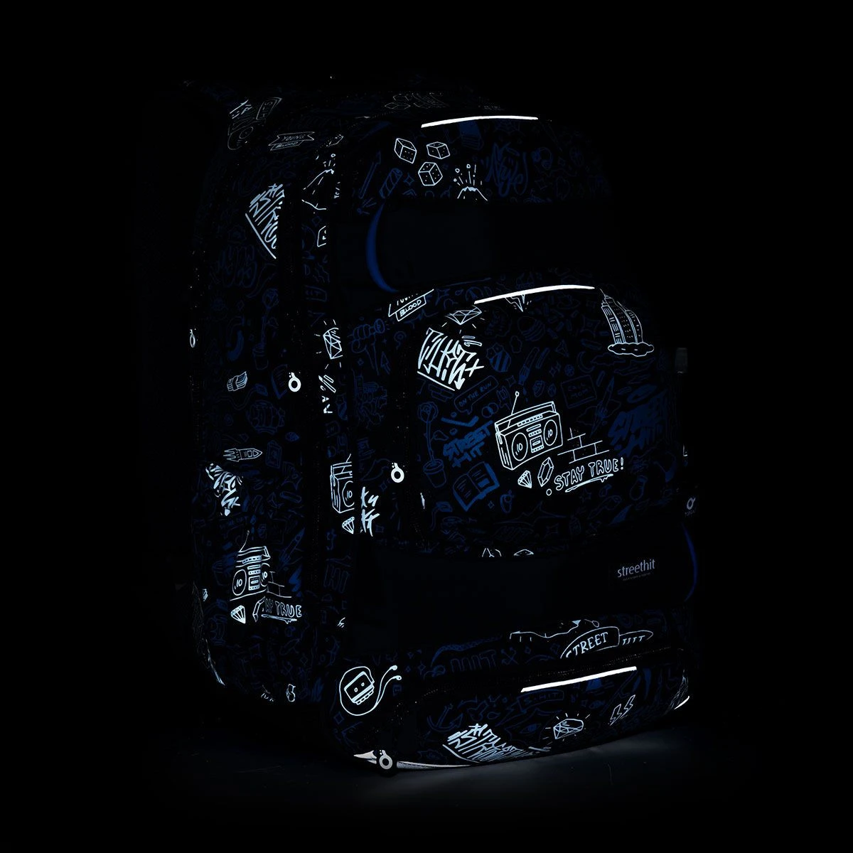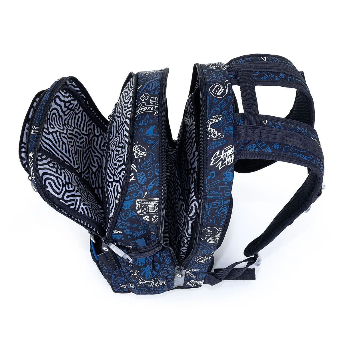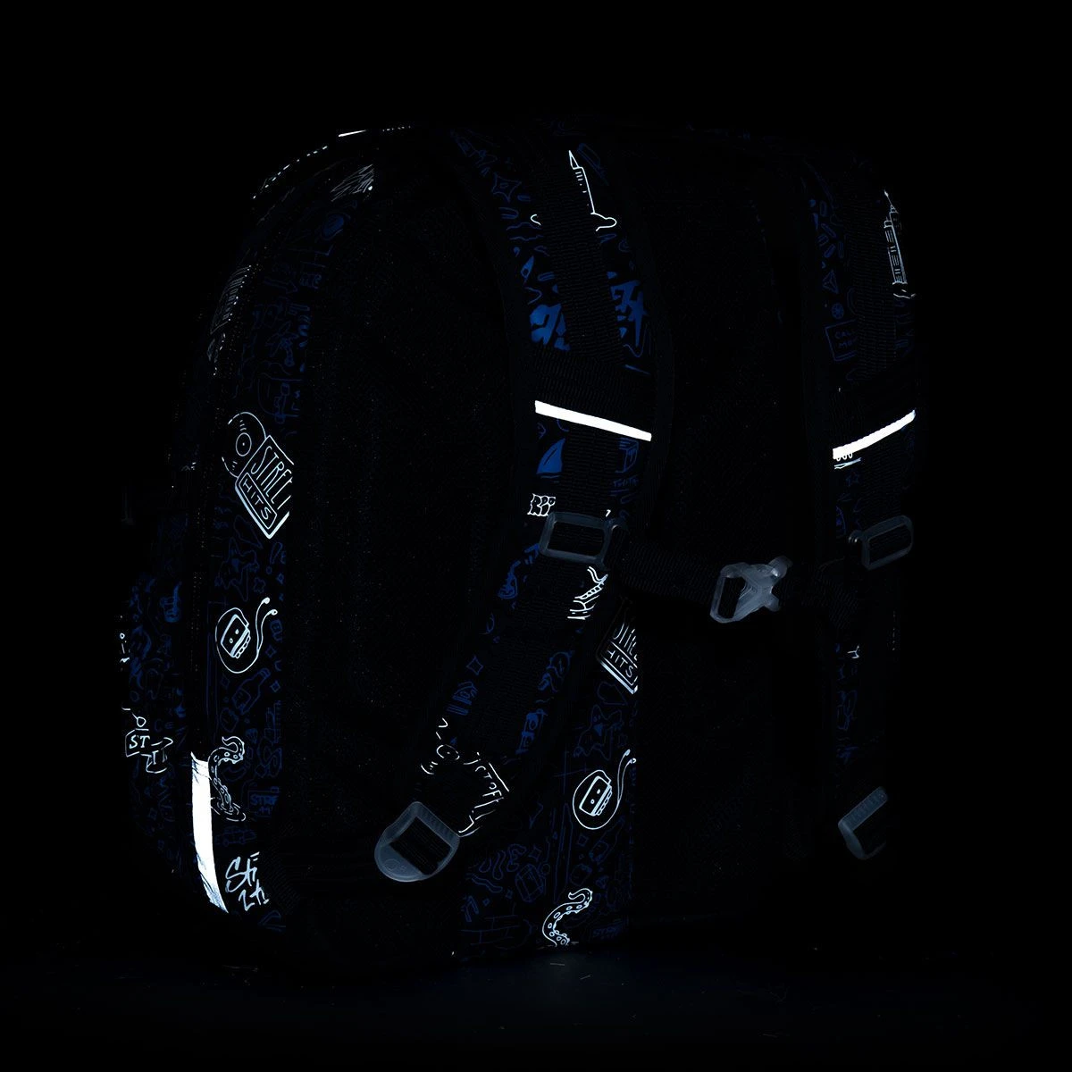 Schwarzer Studentenrucksack mit kleinen blauen und weißen Bildern ala Doodle Art. Der voluminöse Zweikammer-Rucksack wird von Schülern der 2. Stufe und Gymnasiasten gerne getragen. Der Rücken des Rucksacks ist gepolstert, anatomisch geformt und dank einer leichten Aluminiumverstärkung stabil. Im Inneren des Rückenfachs befindet sich ein gepolstertes Fach für einen Laptop und ein Tablet sowie ein weiteres, kleineres Fach für ein Mobiltelefon oder eine Powerbank.