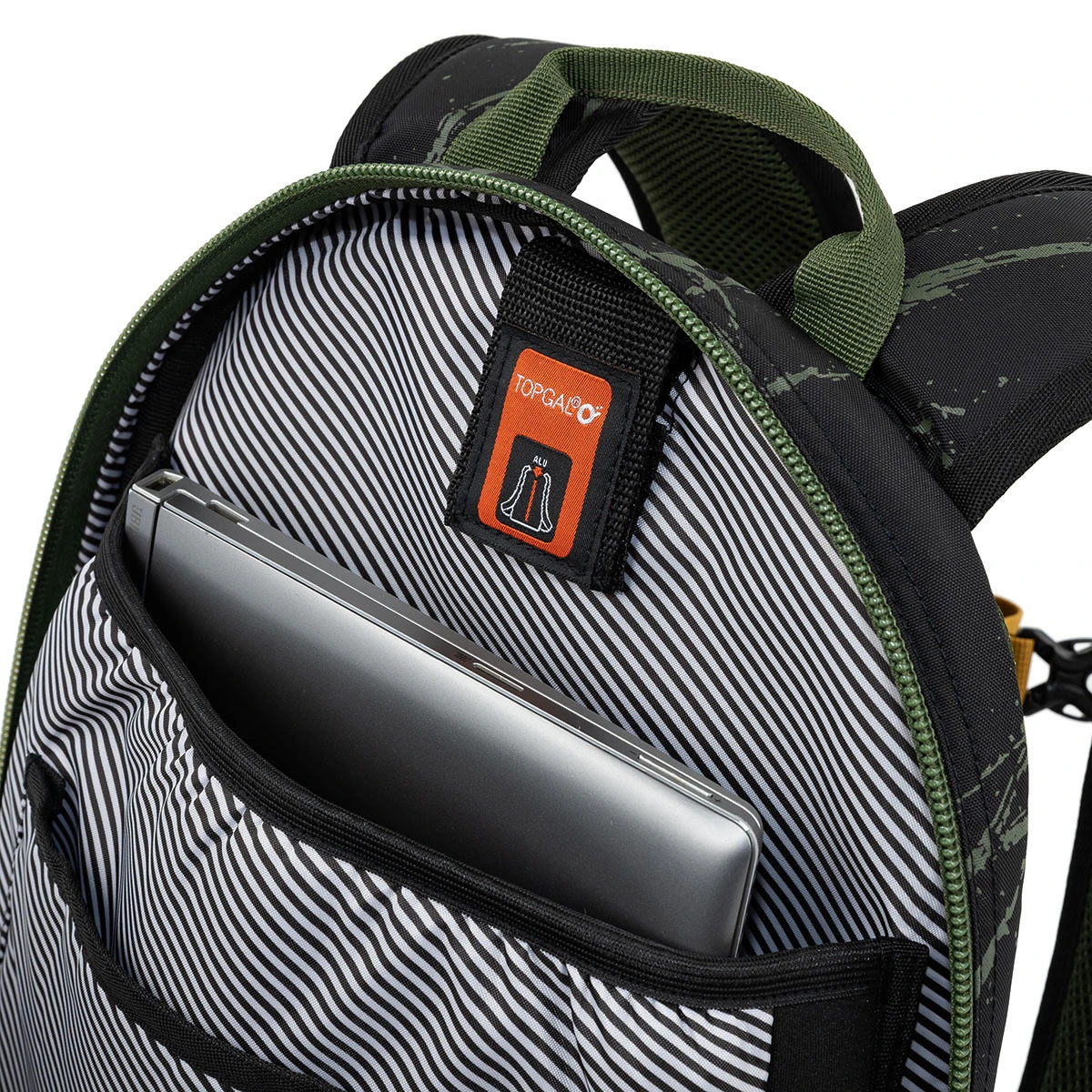 RUBI Studentenrucksack in Schwarz mit khaki- und senfgelben Details. Idealer Rucksack für Schüler der zweiten Stufe der Grundschule, des Gymnasiums und der Hochschule. Die Rückseite des Rucksacks ist weich gepolstert, anatomisch geformt und mit Aluminiumverstärkung verstärkt. Auch die Schultergurte sind gepolstert und anatomisch geformt. Diese sind höhenverstellbar, ebenso wie der Brustgurt.
